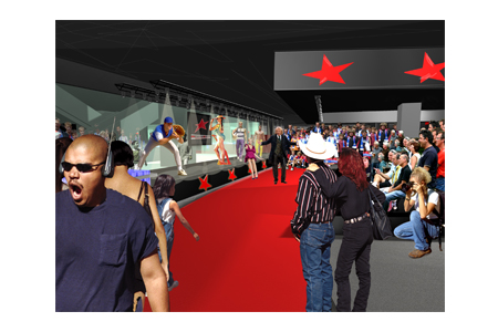 Ein neues Konzept für die cool-günstig-jung Sportkette zeigt eine reduzierte Farbgebung und punktuelle Highlights. Während Decken, Boden, Wände in Dunkelgrau-Tönen gehalten sind, schlängelt sich ein meanderner roter Hauptweg durch die gesamte Filiale und verbindet Stationen miteinander, wie den Runway, die Aktions-Satelliten und die Sitztrommeln.