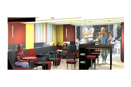 Das Konzept für Anker-Filialen mit großem Verzehrbereich wurde in einer Beispielfiliale mit geringen Mitteln und großer Wirkung durchgeführt. Geschaffen wurden Zonen unterschiedlicher Intimität und Schnelligkeit, unterschiedlicher Materialität und Farbigkeit, die den Gast zum Verweilen und Wohlfühlen einladen ohne aufdringlich zu sein.