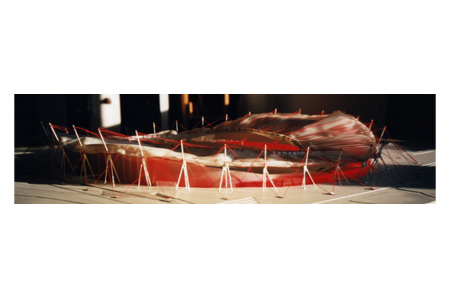 Die Besonderheit des Entwurfs ist die Dachkonstruktion, getragen von den schlanken Stützen, die ihre organische, 'giraffenartige' Form durch statische Notwendigkeiten erhalten. Mit einem Seilsystem und Rückspannungen tragen sie ein aufblasbares, in Kammern gegliedertes Pneudach, dass je nach Bedarf gehoben oder gesenkt werden kann. So lässt sich das Fassungsvermögen des Stadions entsprechend der Zuschaueranzahl in kürzester Zeit und ohne baulichen Eingriffe regulieren.