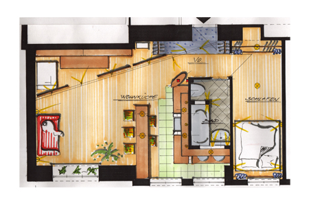 Umbau einer typischen 50er Jahre Wohnung in Wien zu einem offenen Lebensraum mit integrierten Arbeitsbereich und maßgeschneiderten Elementen.